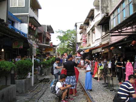 このように平渓線の線路のまわりにお店が沢山あり、線路の上でみなさん天燈上げを行っています。(もちろん電車がくると一気に履けます(笑))